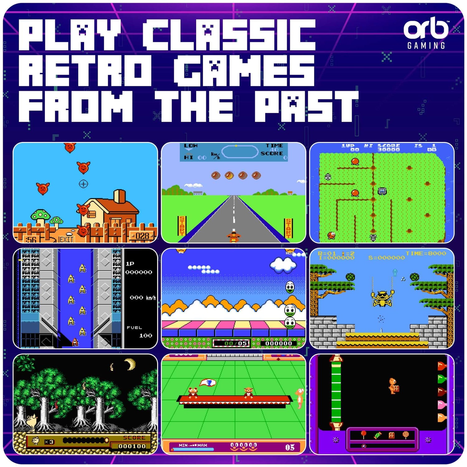 • Mini arcade machine with 300 built-in 8-bit retro games across action, puzzle, racing, shooting and strategy categories