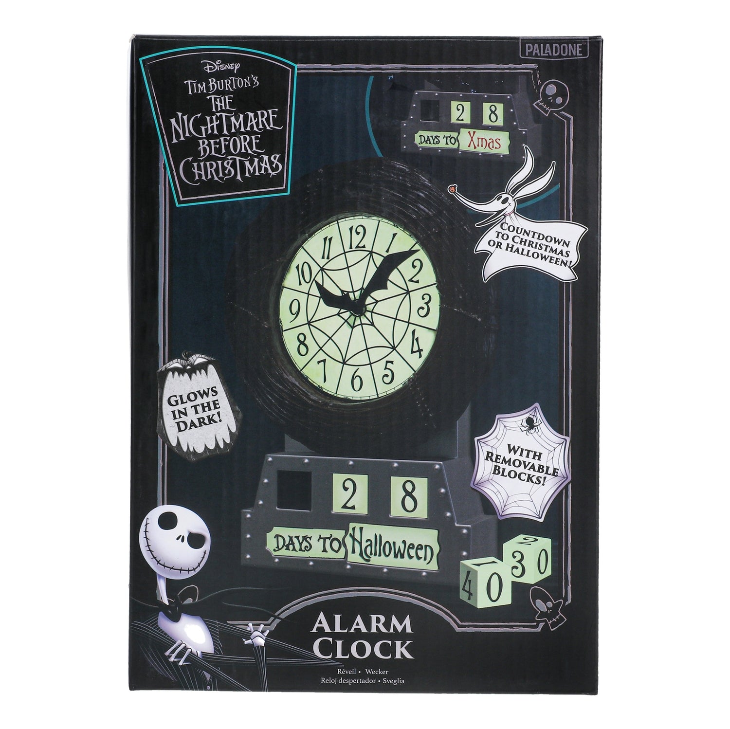 The Nightmare Before Christmas Alarm Clock will make a spooky addition to your home. A replica of the film's town hall clock, you can recreate the countdown to Halloween and Christmas. Glow in the dark clock face21cm (8.3 ) tall shaped alarm clock with removable blocksPowered by 1x AA battery (not included)Officially licensed Disney product